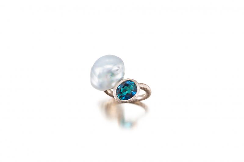 I bought this stone at a trade fair a year ago; it was so extraordinary and the colour was rare. Indicolite tourmalines come from Africa. I kept the stone waiting on my desk for a long time, until I came upon a very irregularly shaped baroque pearl. The pearl's irregularity inspired us to opt for a matt, hammered surface on the white gold.